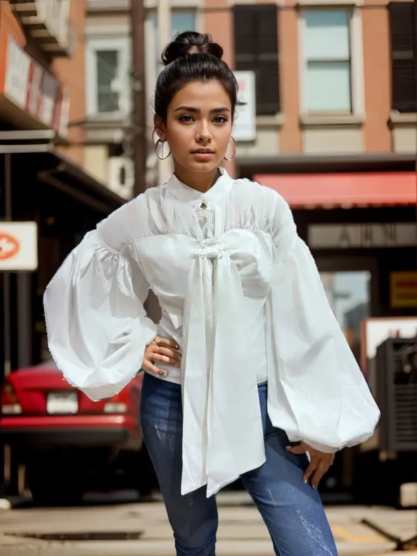 Elegant White Balloon Sleeve Tie-Up Blouse