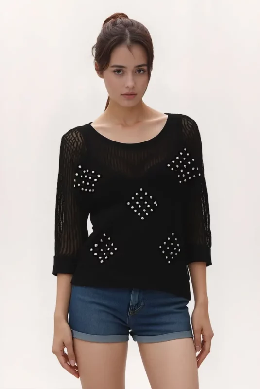Black Rhinestone Top – Crop length – Embellished Stones – Mesh full Sleeve