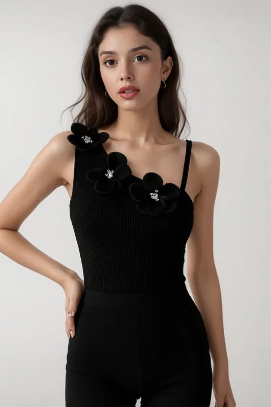 ₹700.00Elegant Black One-Shoulder Top with Floral Appliqué
