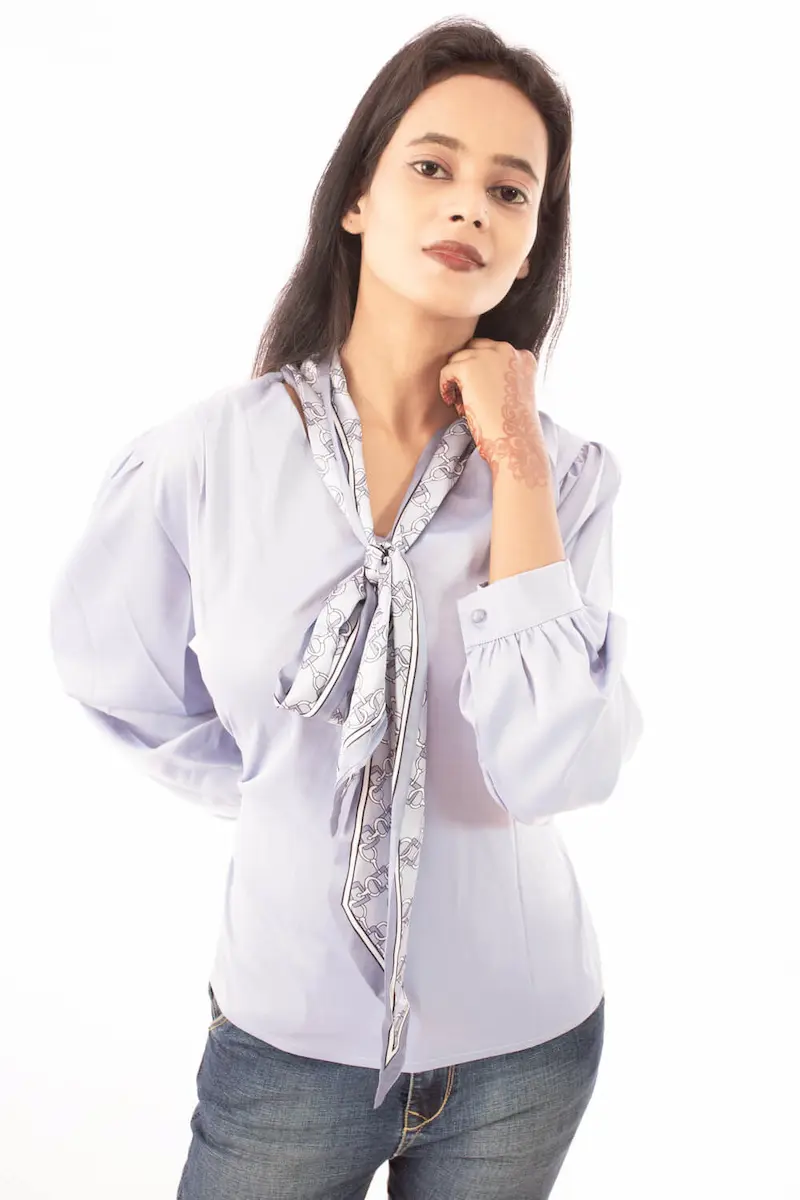 Add a touch of sophistication to your wardrobe with the Lavender Grace Satin Blouse. Crafted from a smooth, satin-finish fabric in a delicate lavender hue, this blouse features subtle puff sleeves and a soft V-cut neckline for a flattering silhouette. The look is completed with a stylish printed neck scarf tied into a bow, blending classic charm with modern flair. Ideal for both office wear and casual chic outings, this blouse pairs beautifully with jeans or tailored trousers.