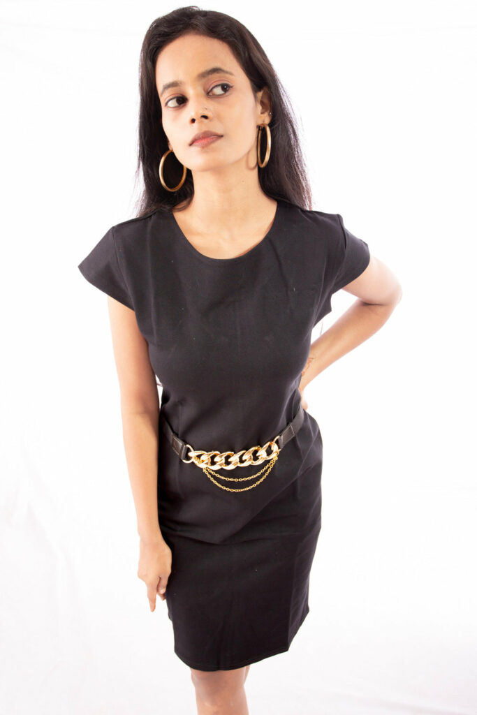 ₹550.00Black Cap Sleeve Sheath Dress with Gold Chain Belt