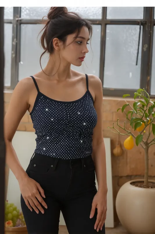 Shine bright in this dazzling Silver Sequin Party Top, designed for those who love to make a bold entrance. Adorned with reflective sequins throughout, this spaghetti strap top adds instant glamour and sparkle to your evening look. The V-neckline and fitted silhouette enhance your figure, while the lightweight lining ensures comfort during long hours of wear. Perfect for club nights, parties, or festive celebrations, pair it with jeans for a chic-casual look or a skirt for full-on glam.