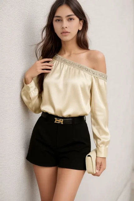 Golden Satin Wrap Top with Balloon Sleeves